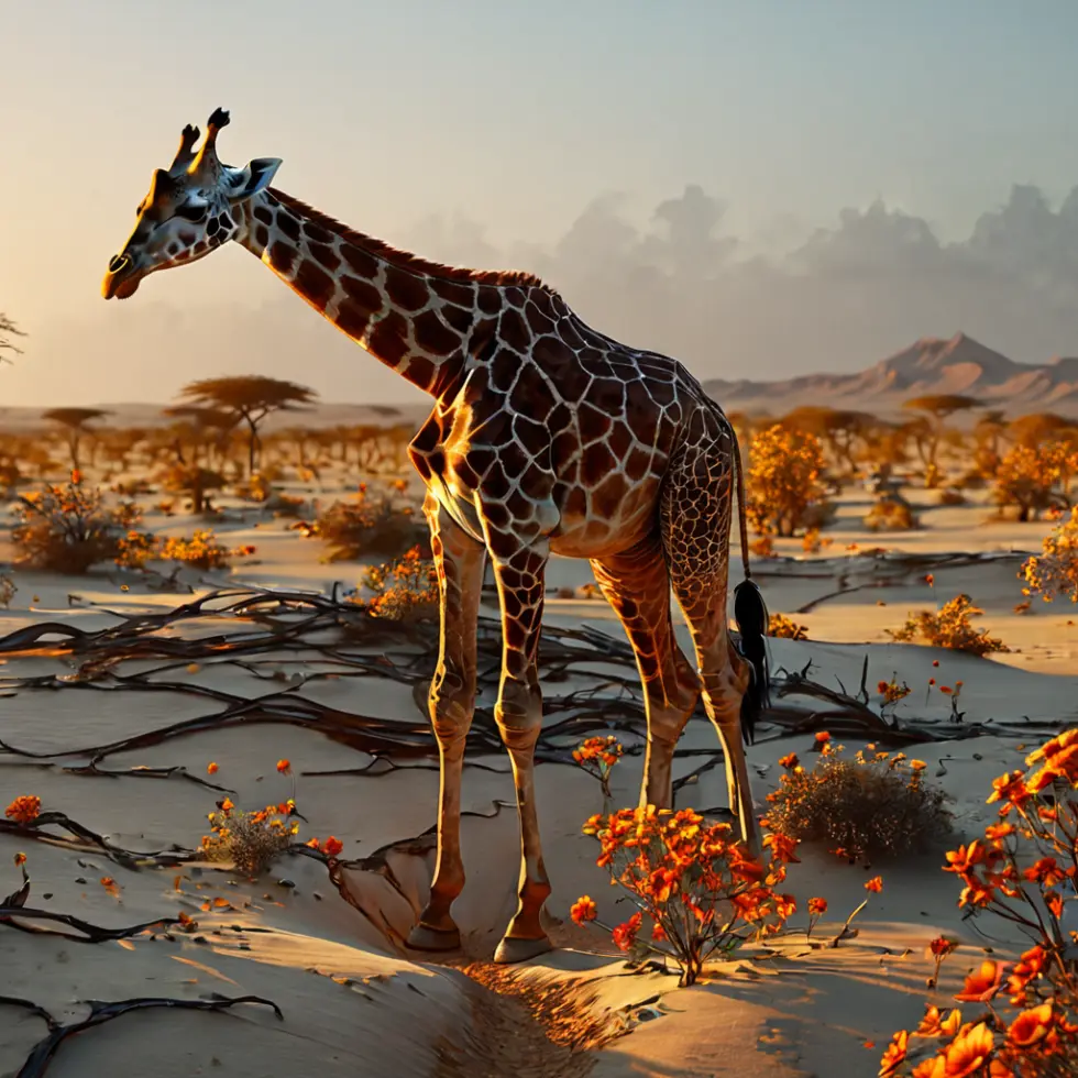 Giraffe in desert at sunset