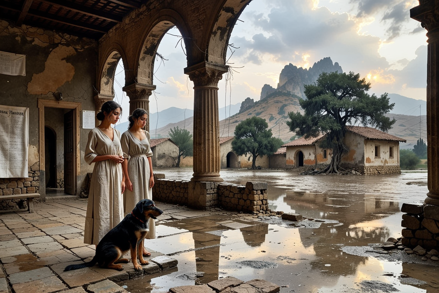 Woman and dog in front of rain-soaked ruins